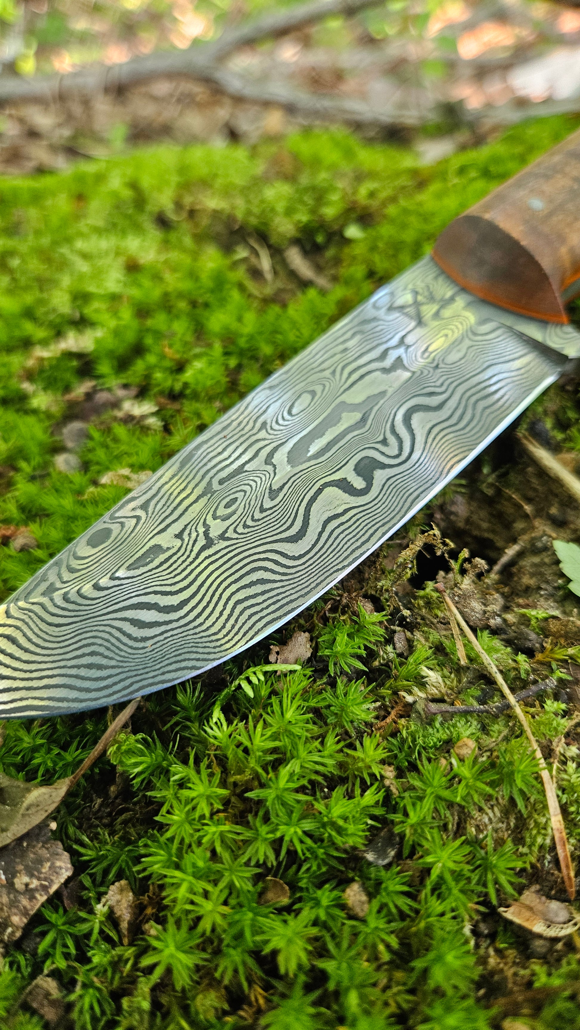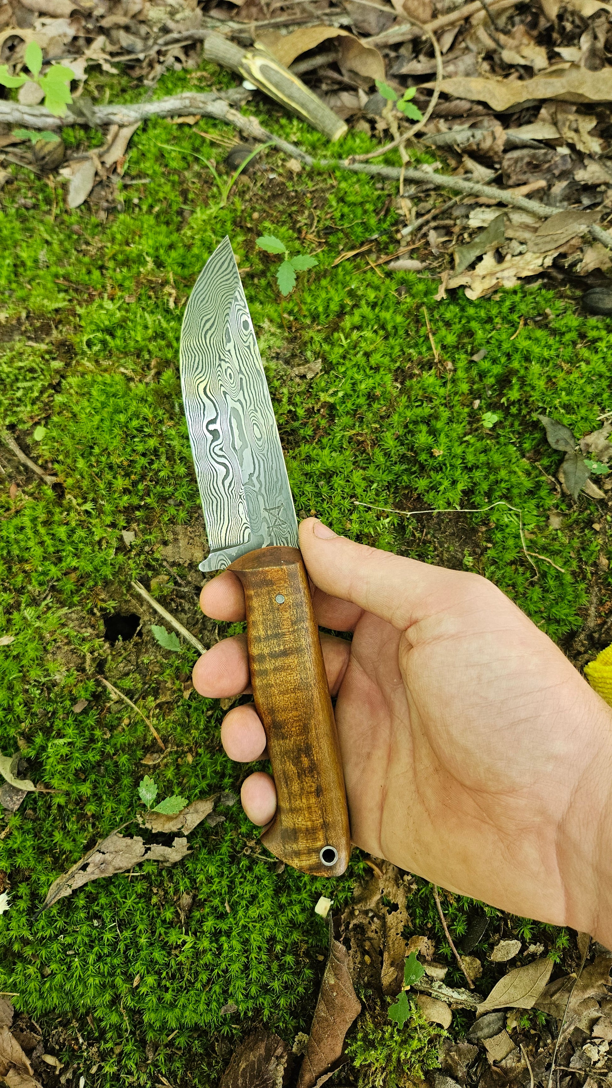 The perfect blend between bougie and utility! A polished, raindrop damascus blade and a curly maple handle is sure to draw eyes anywhere you use this!