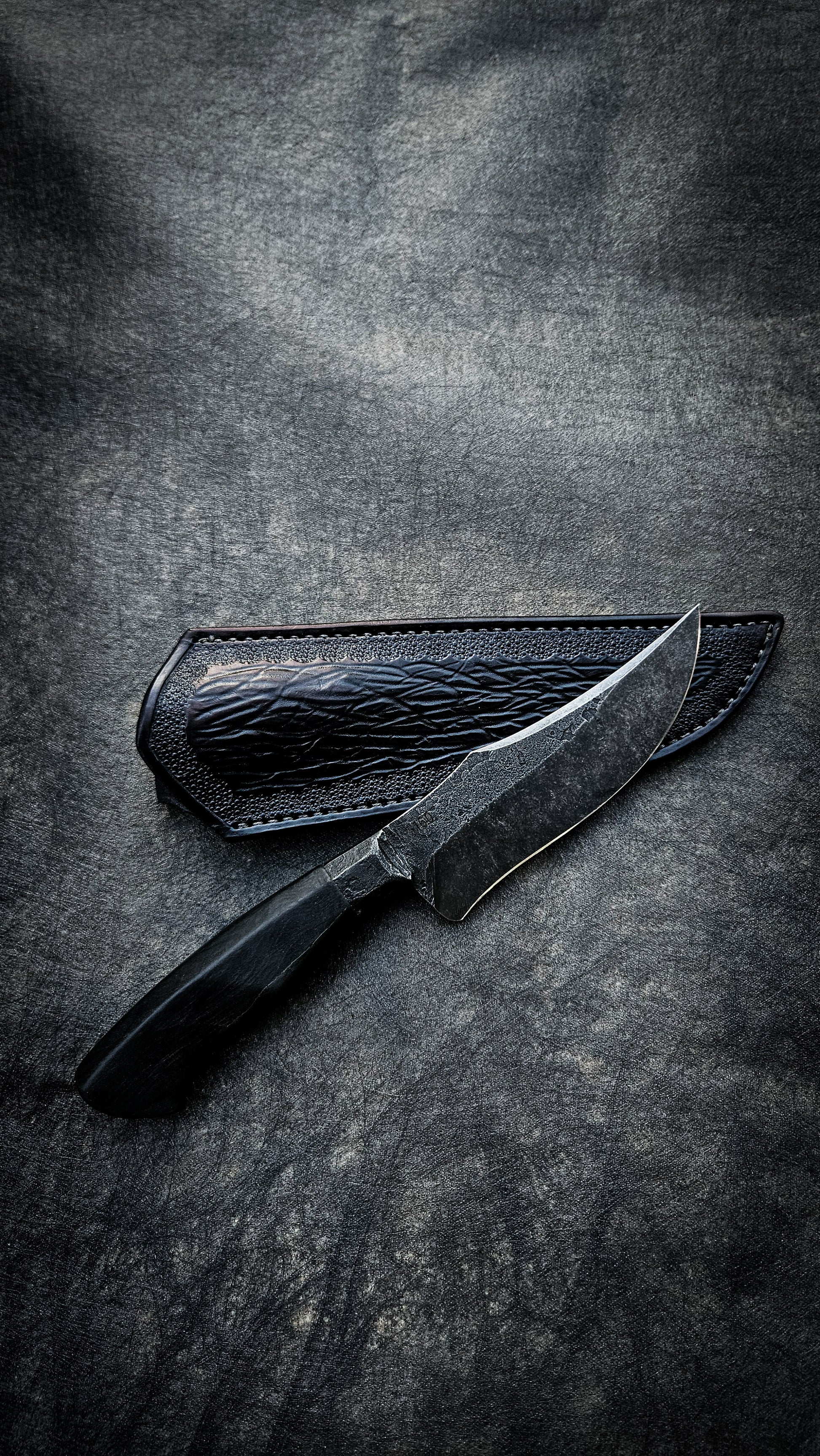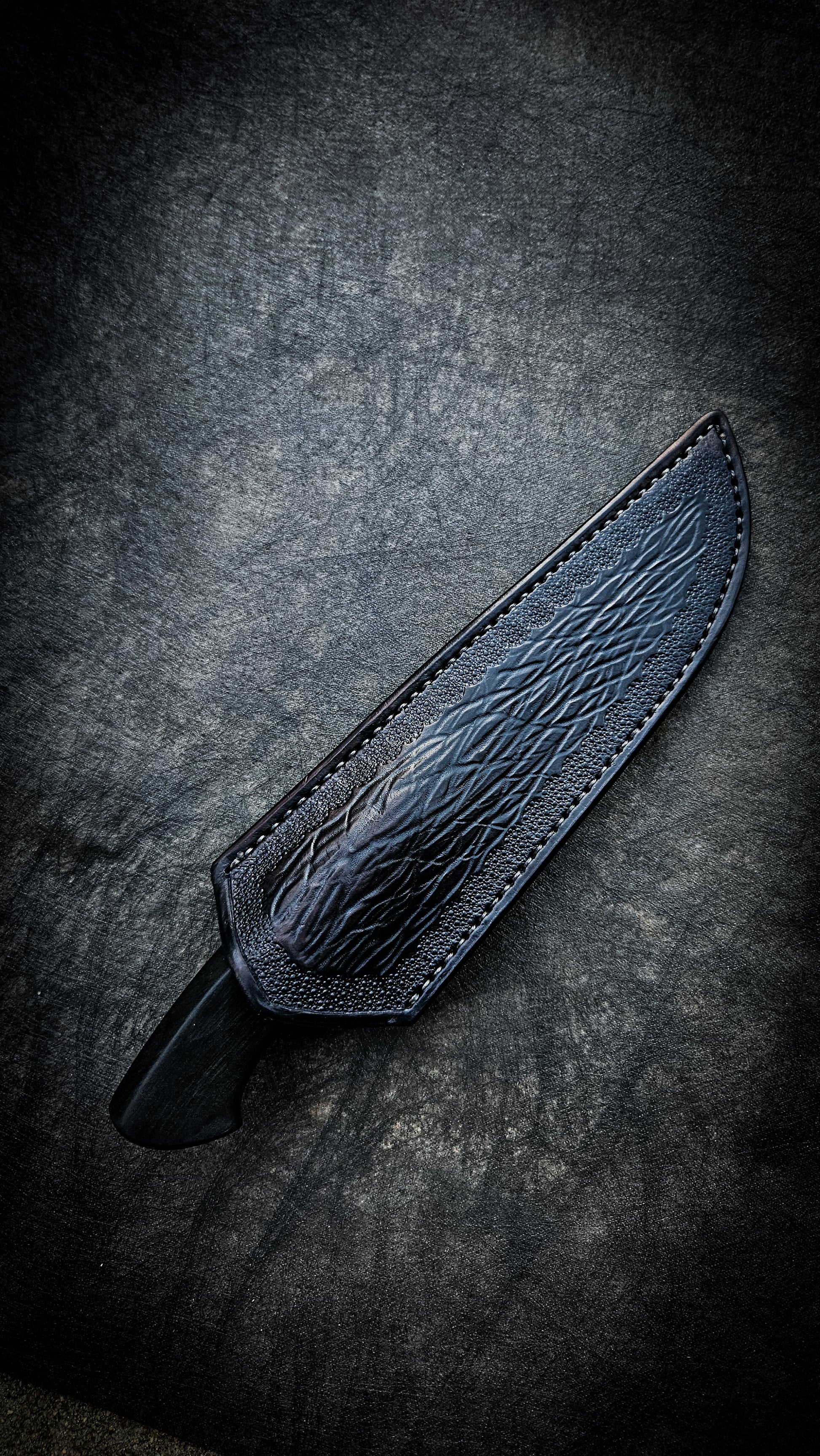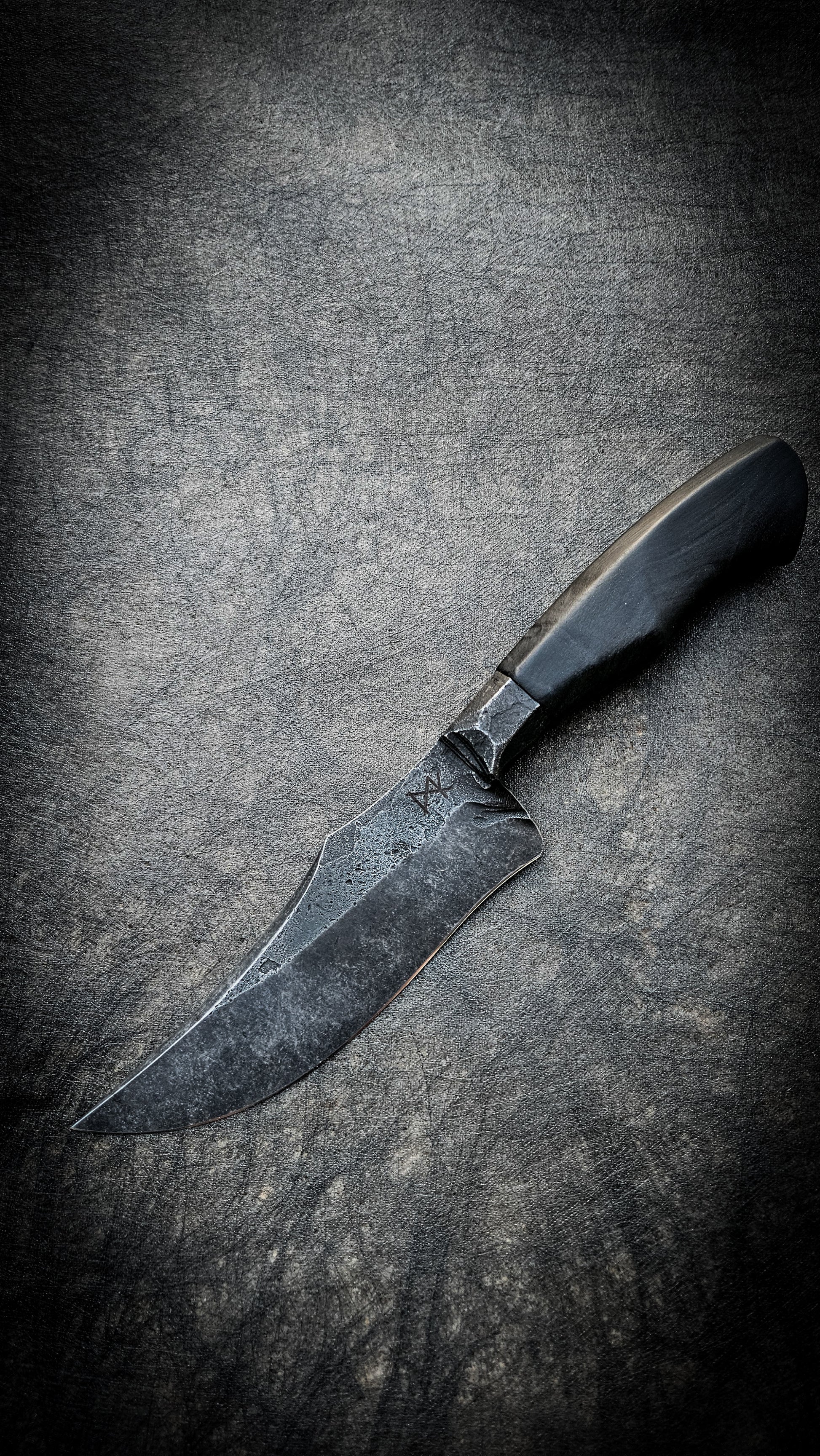 This knife is ready to work! Forged from a solid piece of 5160 and fitted with a stabilized piece of maple this one is sure to handle anything you throw at it. All wrapped in a hand tooled and hand stitched USA leather sheath!